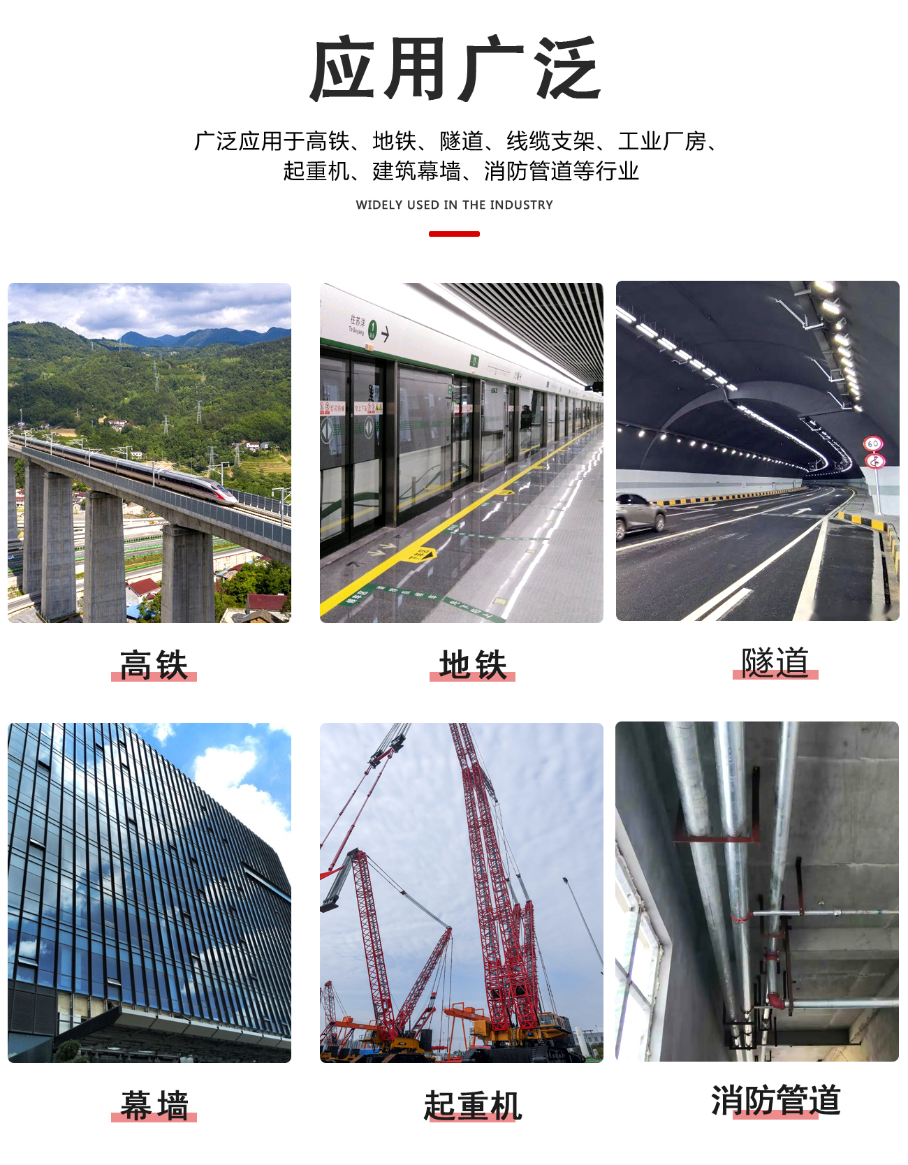 高鐵,地鐵,橋梁,隧道中各類管道,線纜支架的安裝固定?!窆I(yè)廠房,起重機(jī),核電站,等大型設(shè)備的安裝固定。各種鋼結(jié)構(gòu)和幕墻結(jié)構(gòu)等不同支撐的連接固定。 民用建筑各種管道如水電管道,消防管道的安裝固定。