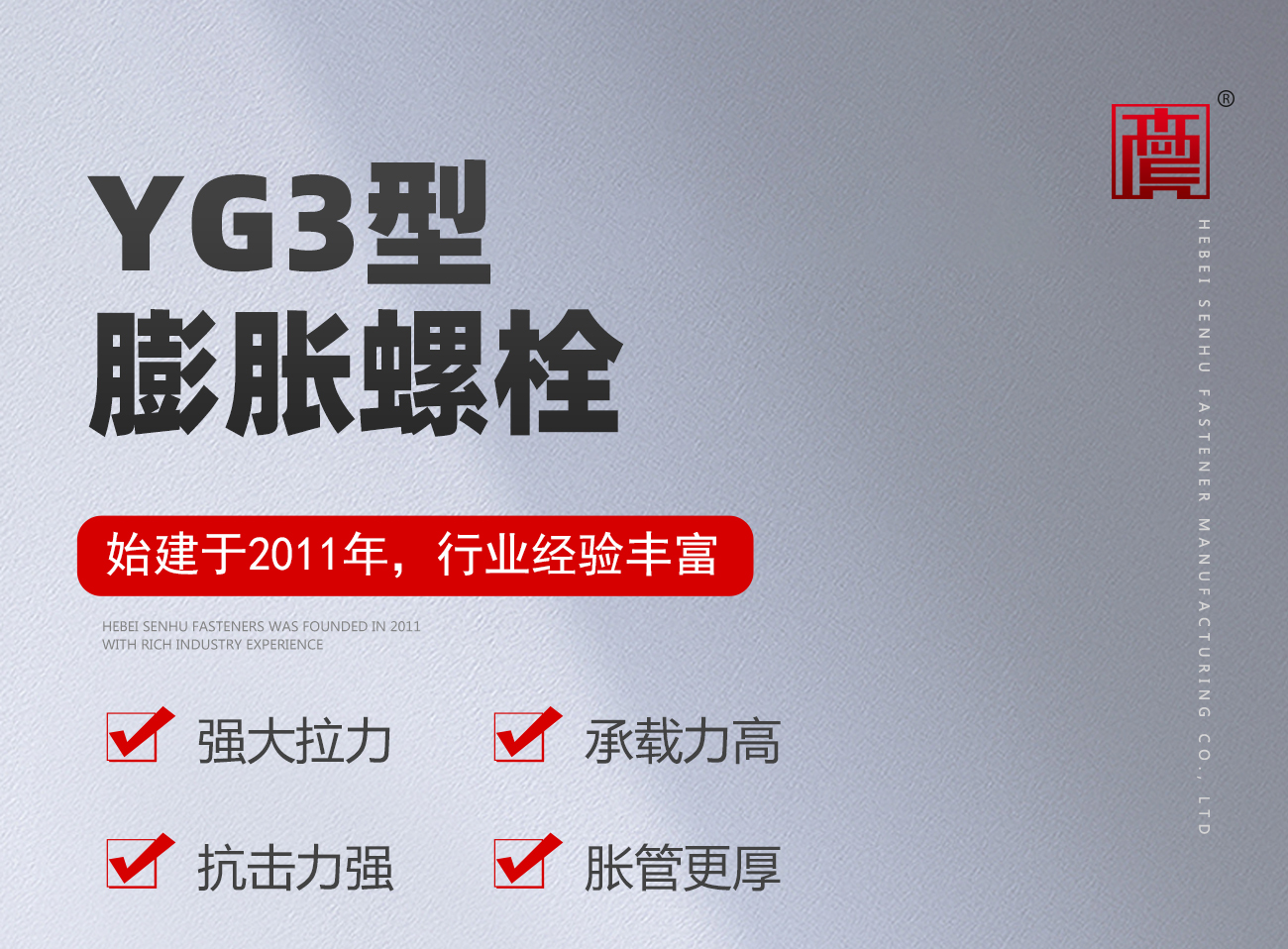 主要生產:化學錨栓、機械錨栓、定型化學錨栓、高強度8.8級化學錨栓、自切底錨栓、車修壁虎,膨脹螺栓,植筋膠等,產品暢銷全國