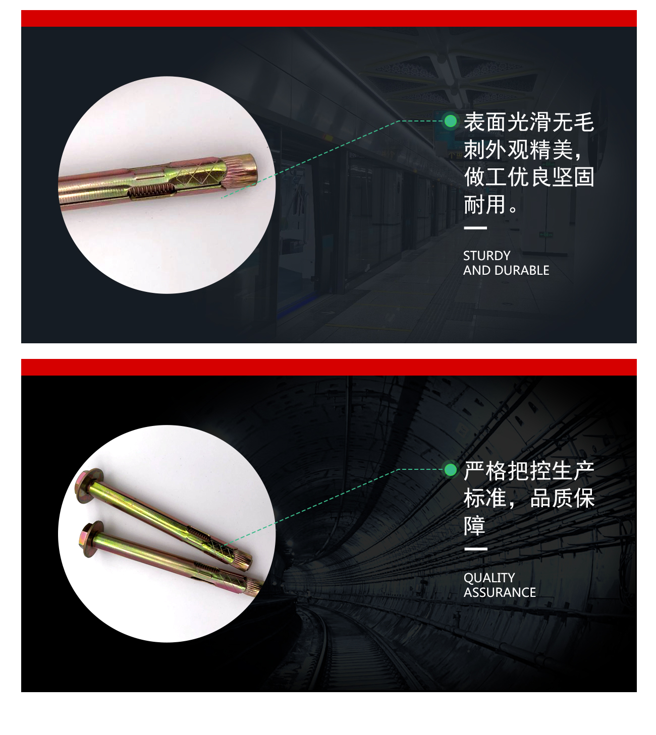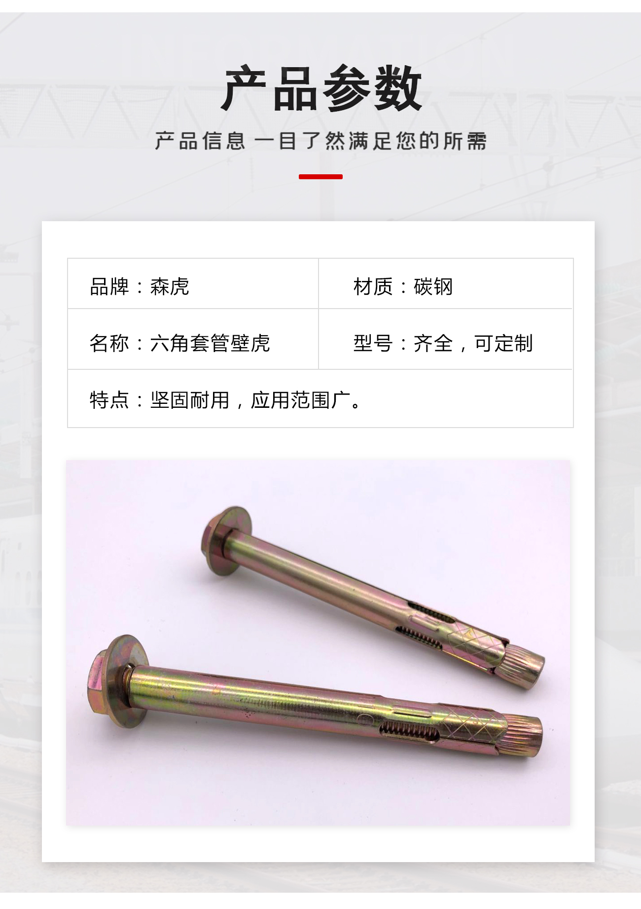 規(guī)格型號 公制GB-M6、M8、M10、M12、M16美制ASME-1/4、5/16、 3/8、1/2、 5/8 產(chǎn)品說明 適用于鋼結構、電纜線路、門窗、地板安裝托架、樓梯、房屋外墻飾面等適中負荷固定作用。